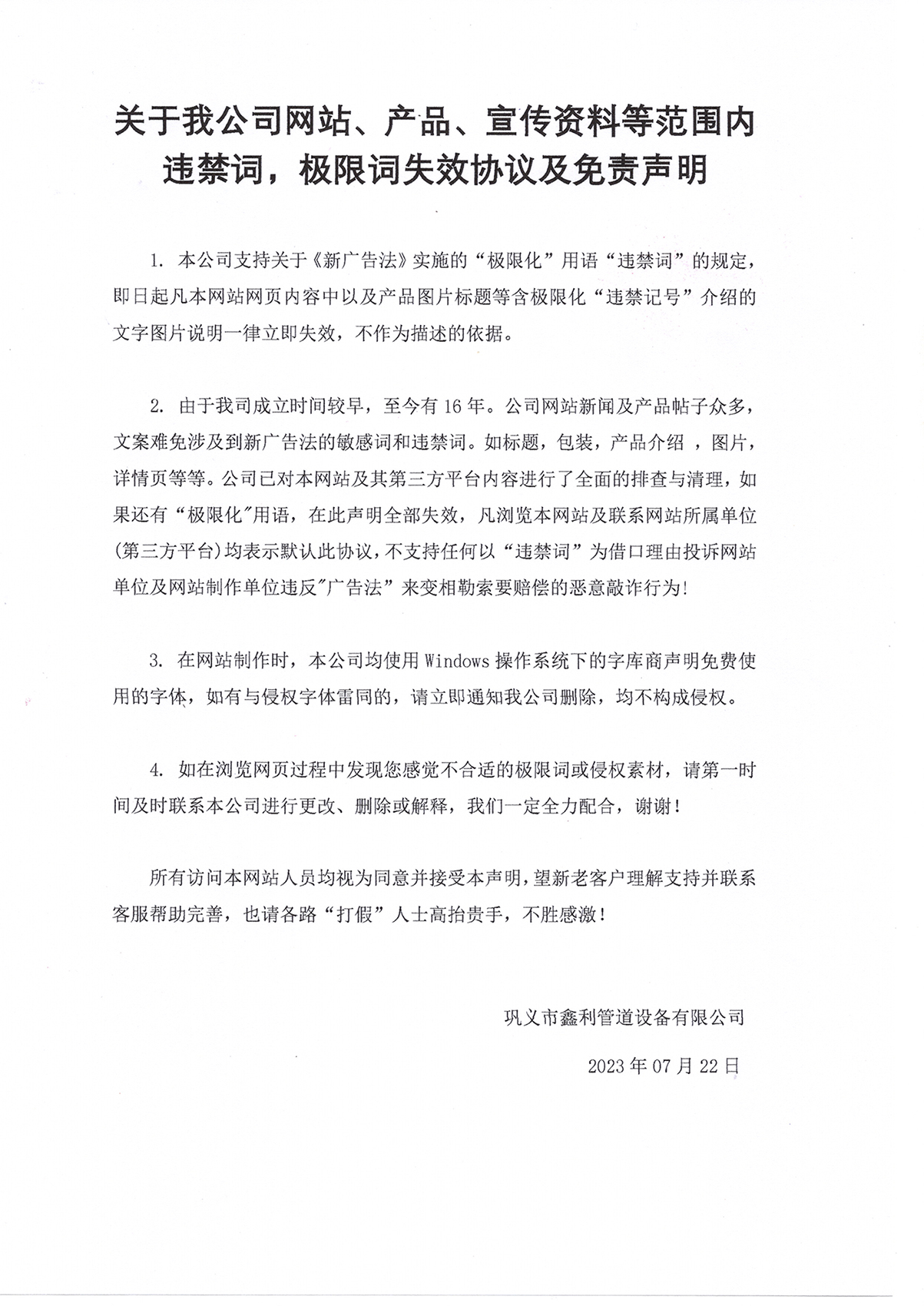關于我公司網(wǎng)站、產(chǎn)品、宣傳資料等范圍內(nèi)違禁詞,極限詞失效協(xié)議及免責聲明